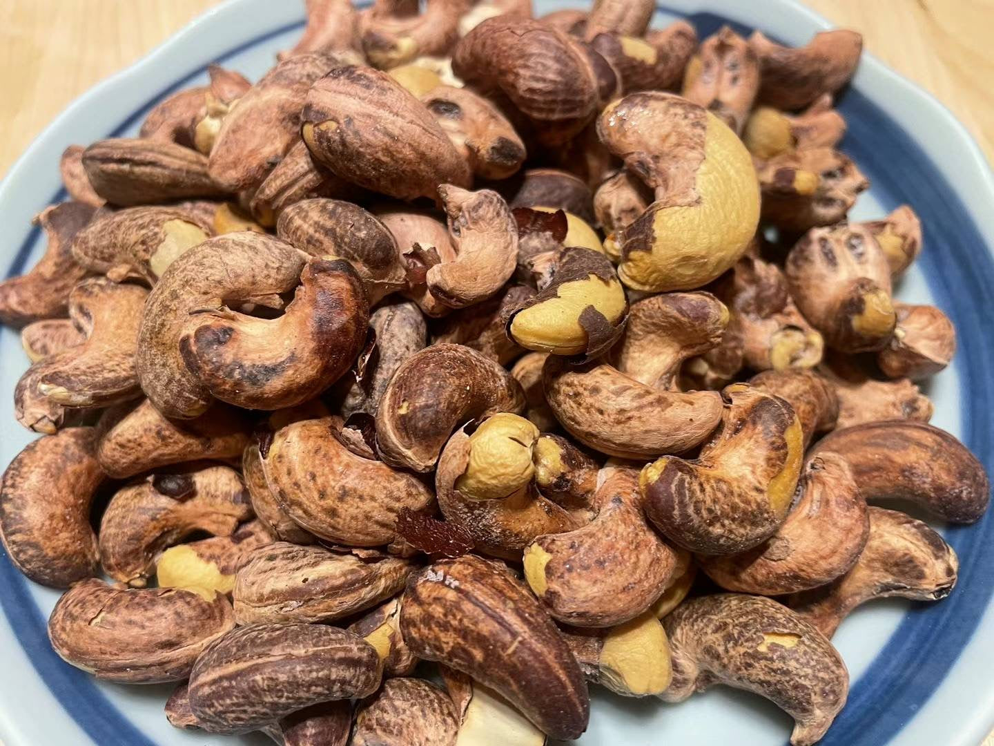 腰果本身是有彎曲的,所以中間凹處多少都會有卡鹽巴的現象❗️食用時,如果看到凹處有白白的鹽,🉑以將皮剝掉再食用喔☺️