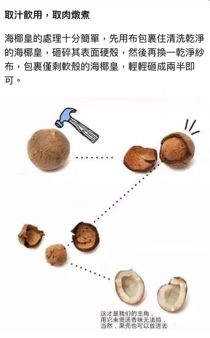 將海椰皇用清水沖冼,用布包住海椰皇BB ,用鎚仔 砸碎其表面硬殼,然后再包裹剩下軟殼的海椰皇,輕輕敲成兩半即可。