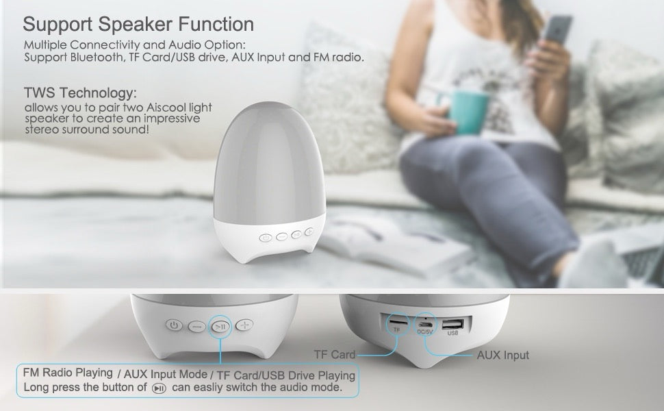 1200 mAh 高容量,夜燈揚聲器🔊可在快速充電 💠2-3 小時後提供 5-8 小時的播放和照明,具體取決於您使用的模式。